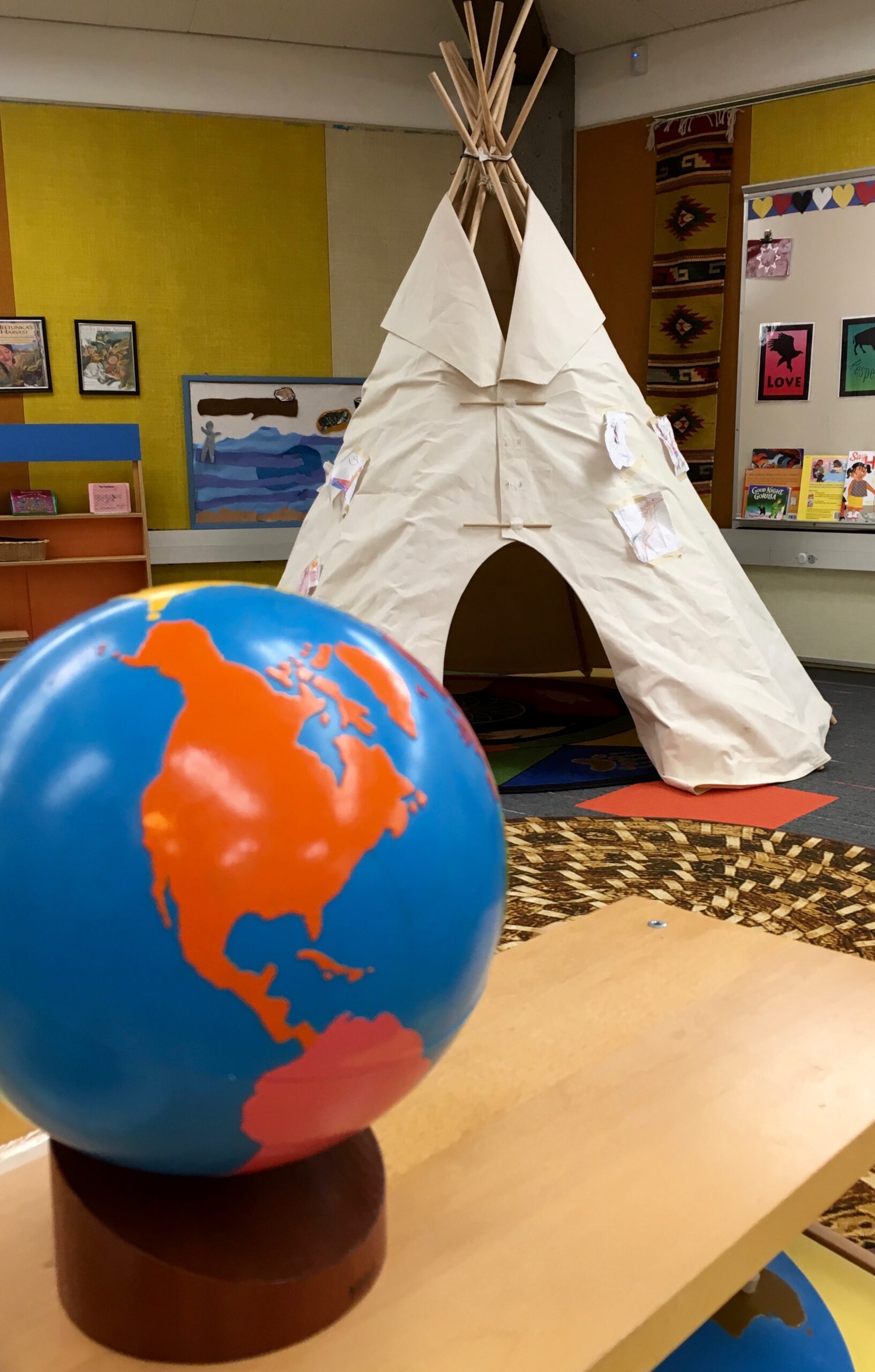 Still, a new, AMS trained primary guide, Carrie Brown, is doing the best she can in challenging circumstances. The classroom looks like a Montessori classroom, and, it clearly embodies Native American traditions. The shelves hold practical life activities and Montessori didactic materials (many of which must be twelve years old or more, although the local Montessori community has helped out). And there’s a tipi, button blankets, a wooden loon to be polished, beautiful hand-sewn garments for traditional celebrations, and language work that reflects the native culture. Ms. Brown has to balance district, state, Indian Education, and Montessori priorities in her environment, and she works hard to build a program that will serve these children and survive in the public school world.